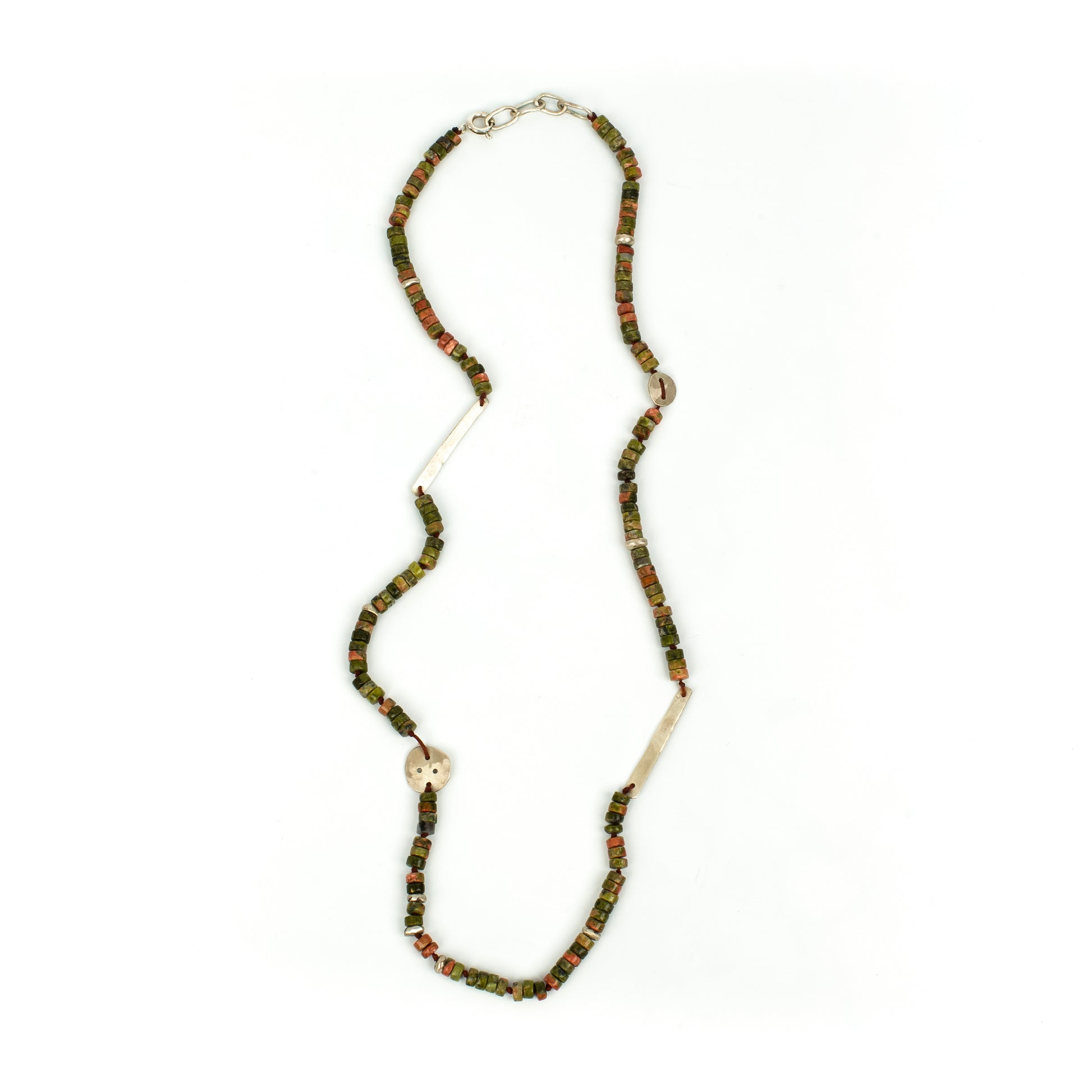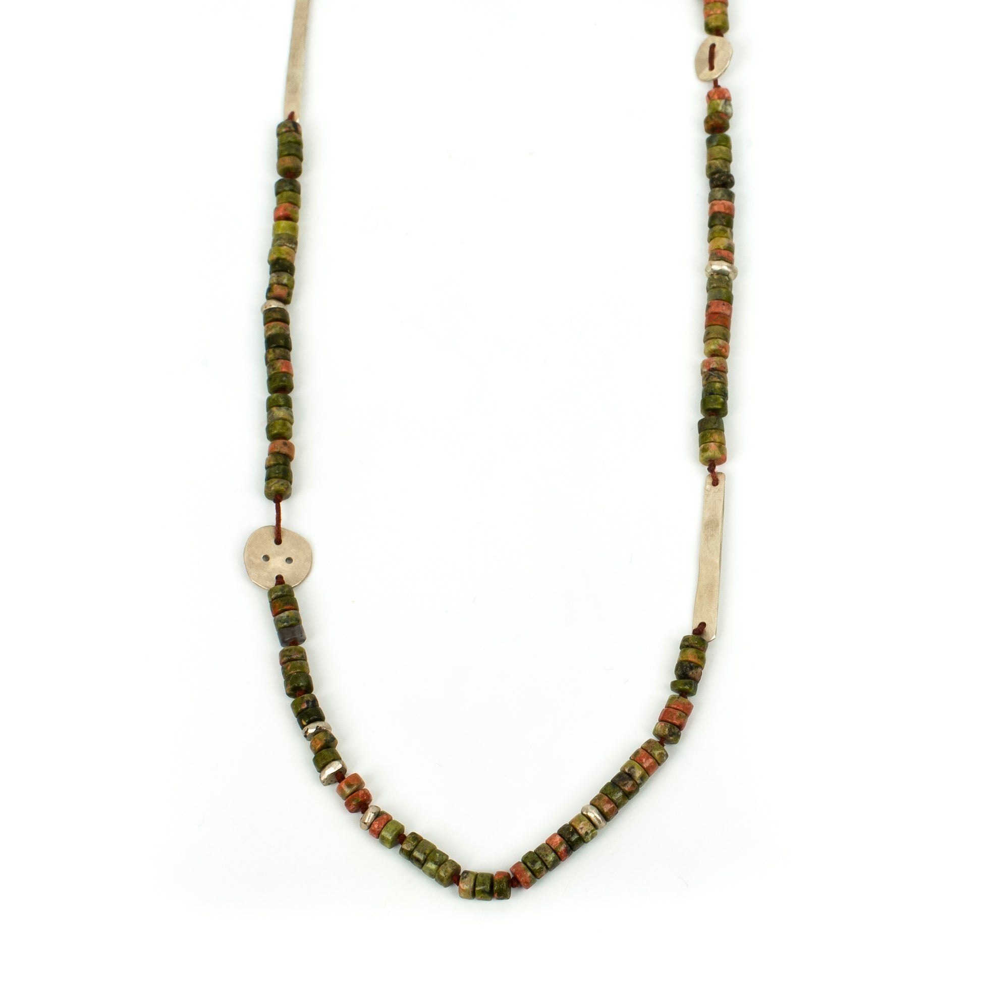 This necklace pairs the distinctive character of Unakite with handcrafted 925 sterling silver details, creating a clean yet powerful look.