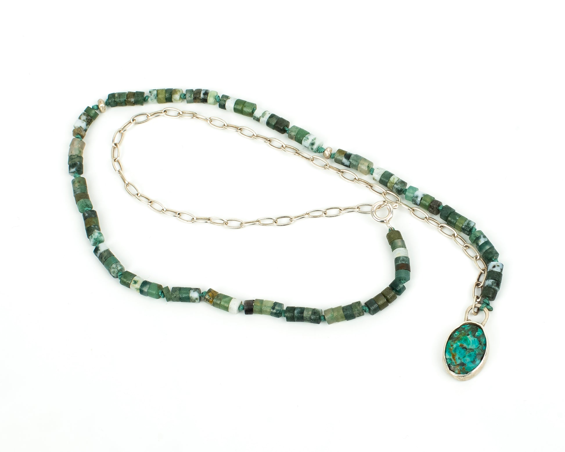 Kar tanesi obsidyen boncuklar, 925 gümüş bar ve zincir detayları. Siyah-beyaz kontrastı her parçada farklı desenler oluşturur.